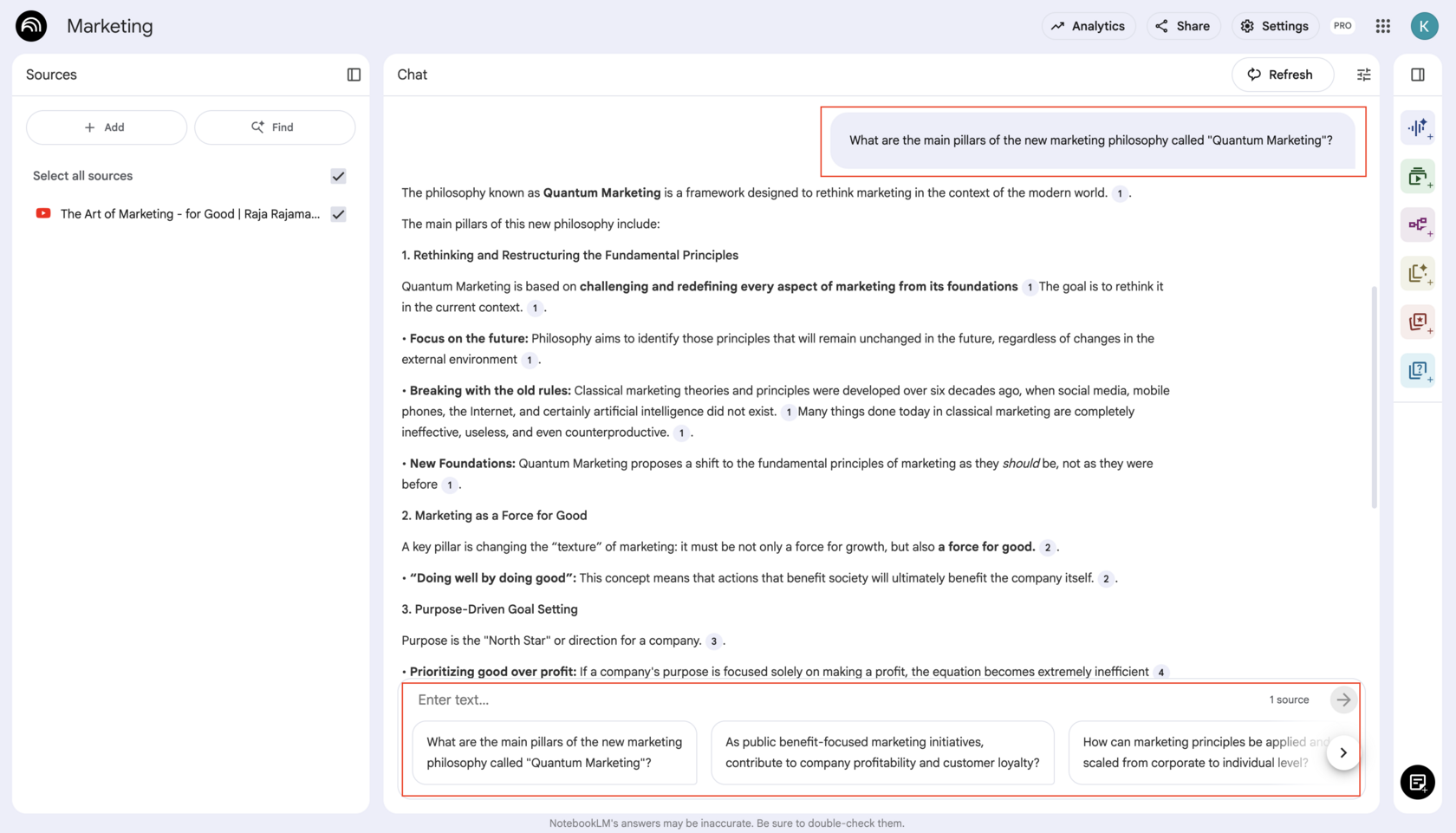 Use the chat interface to query your documents. NotebookLM provides clear answers with citations linking to exact source passages. Every claim is verifiable with one click.
