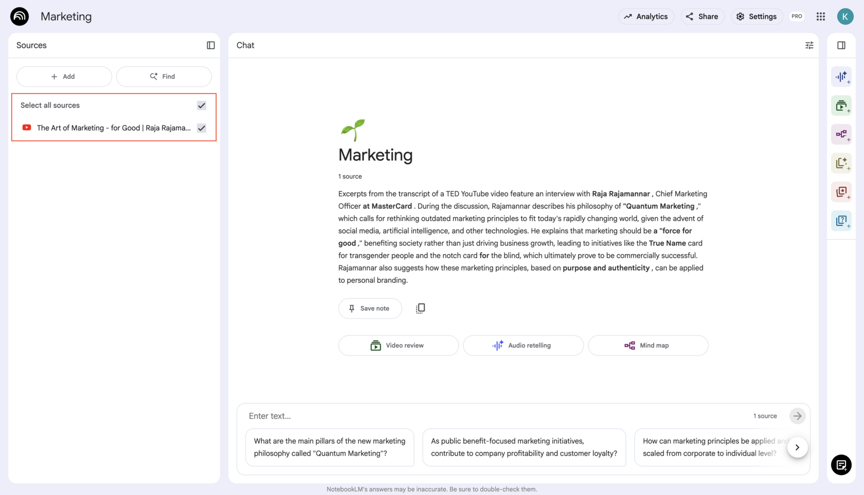 - Multi-format source analysis: Upload PDFs, link websites or YouTube videos, import Google Docs, or add text files.