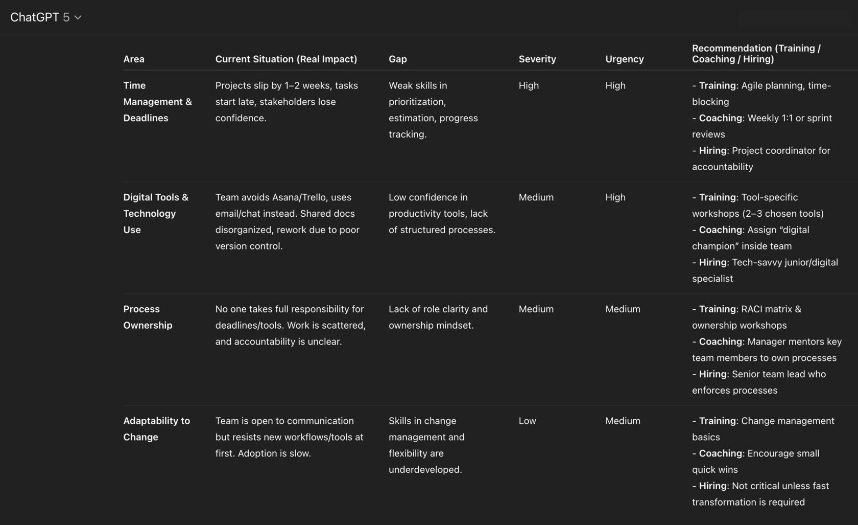 Result: A table highlighting gaps in time management and digital skills, with recommendations for training, coaching, or adding new expertise.