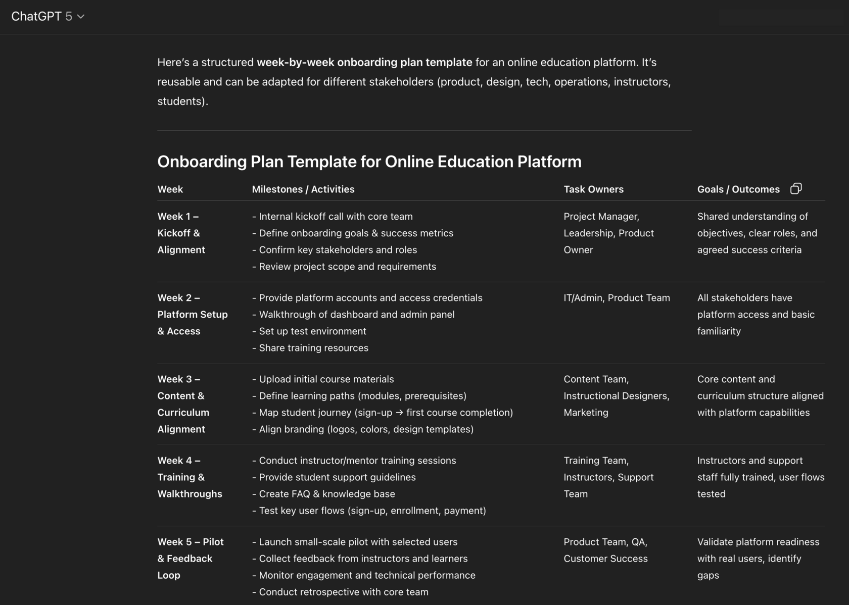 Result: A clear, week-by-week onboarding plan template with assigned responsibilities.
