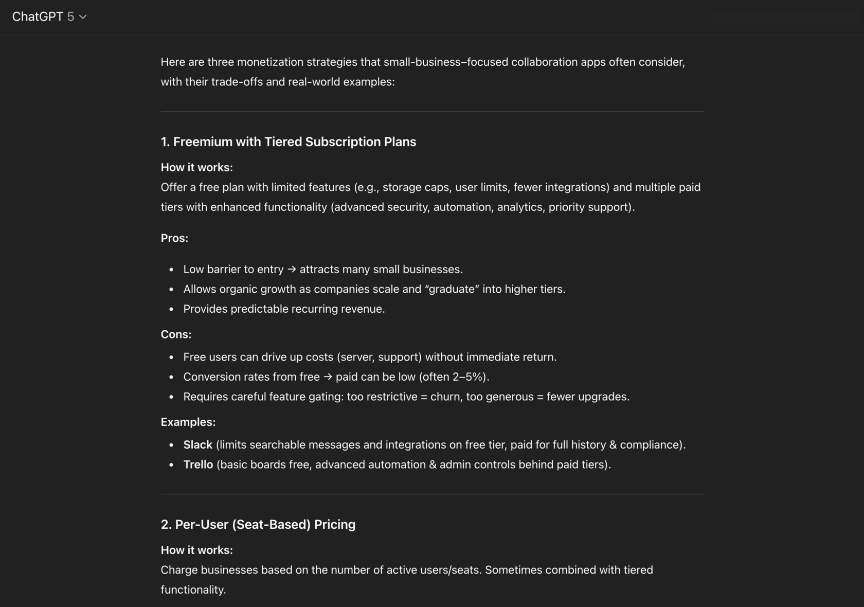 We’re considering pricing changes for a collaboration app aimed at small businesses. Suggest 3 monetization strategies. Include pros, cons, and examples of companies using each.
