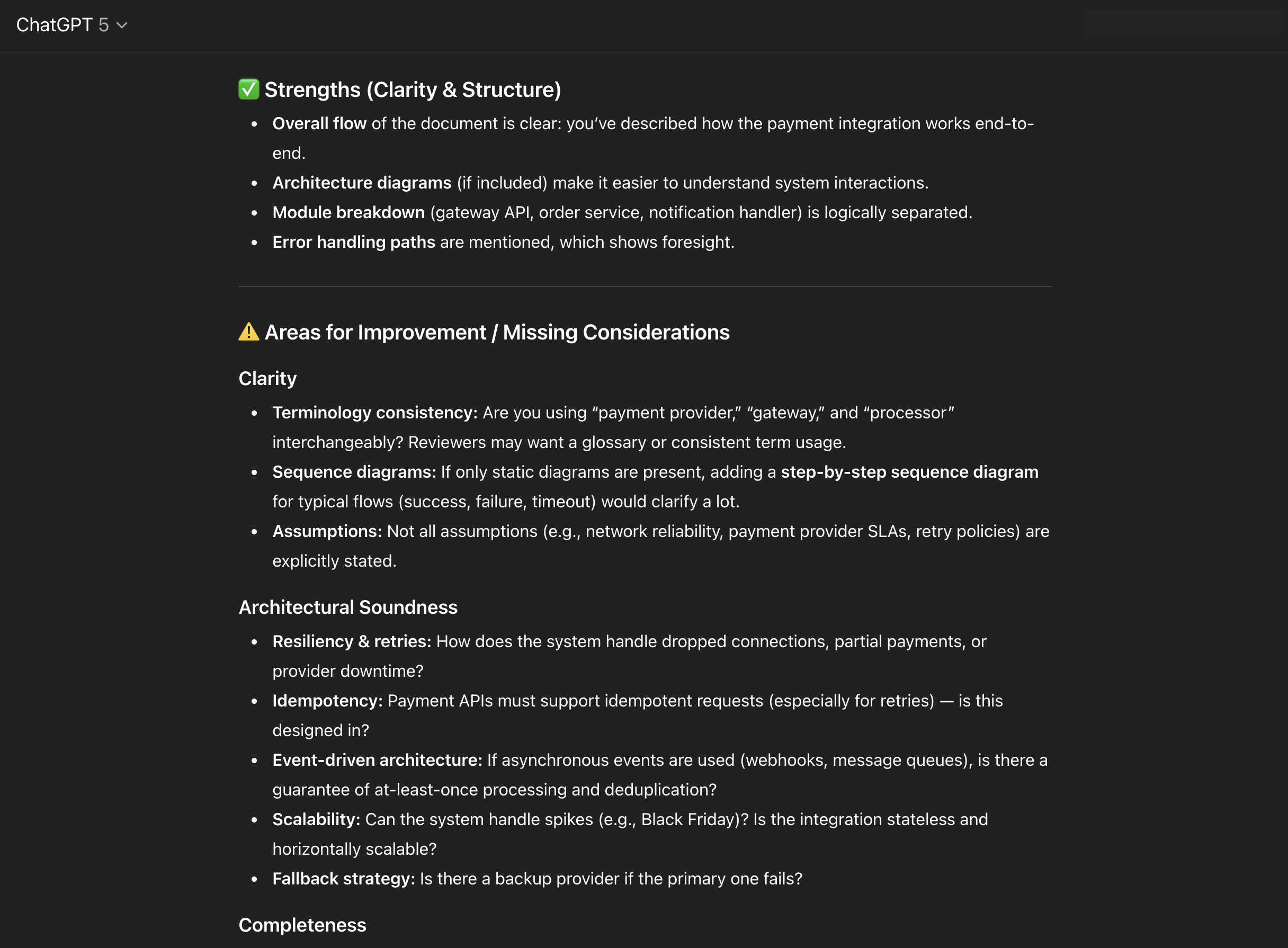 I’ve drafted a technical design document for a new payment integration feature in an e-commerce platform. Review it for clarity, architectural soundness, and completeness. Highlight any missing considerations or questions reviewers may raise.