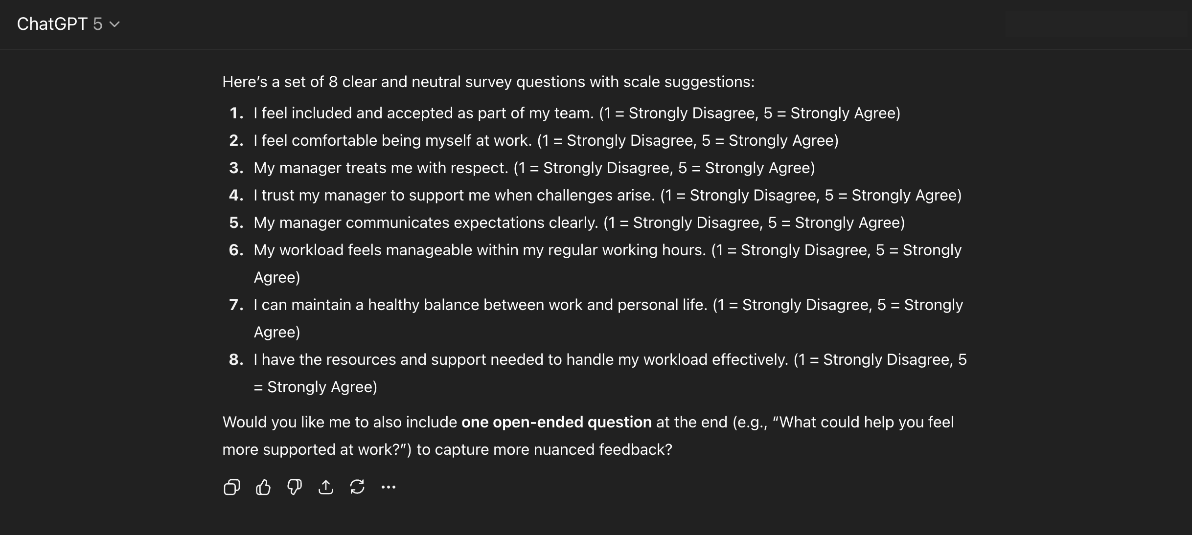 Write 6–8 employee survey questions designed to measure belonging, manager trust, and workload balance. Ensure the questions are neutral and easy to understand. Format them as one question per line with rating scale suggestions.